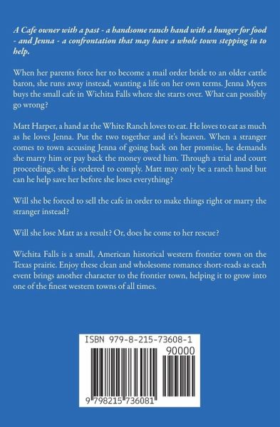 A Cafe owner with a past - a handsome ranch hand with a hunger for food - and Jenna - a confrontation that may have a whole town stepping in to help. When her parents force her to become a mail order bride to an older cattle baron, she runs away instead, wanting a life on her own terms. Jenna Myers buys the small cafe in Wichita Falls where she starts over. What can possibly go wrong? Matt Harper, a hand at the White Ranch loves to eat. He loves to eat as much as he loves Jenna. Put the two together and it's heaven. When a stranger comes to town accusing Jenna of going back on her promise, he demands she marry him or pay back the money owed him. Through a trial and court proceedings, she is ordered to comply. Matt may only be a ranch hand but can he help save her before she loses everything? Will she be forced to sell the cafe in order to make things right or marry the stranger instead? Will she lose Matt as a result? Or, does he come to her rescue? Wichita Falls is a small, American historical western frontier town on the Texas prairie. Enjoy these clean and wholesome romance short-reads as each event brings another character to the frontier town, helping it to grow into one of the finest western towns of all times.