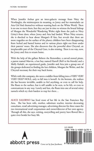 When Jennifer Arthur gets an inter-galactic message from Nitty the Newfangler, she misinterprets its meaning, so Jenny and her marmalade cat Atta Girl find themselves without warning back on the White World. There is no one to meet them, but they are just in time to witness the brutal kidnap of Morgan the Wonderful Wandering Wohtt right from the path to Nitty Gritty?s front door, where Jenny and Atta had landed. When Nitty returns, she is shocked to hear about Morgan?s ill fate, but reveals that there are more tragedies on the surface of the planet; children have been disappearing from locked and barred homes and in various places right out from under their parents? noses. She also discovers that the powerful alien Chrystal, an irreplaceable part of the Chrystal Gate, is also missing. There is no way, now, for Jenny and Atta to return home. With the help of the gallant Behrrn the Remember, a carved stoned pirate, a parrot named Marvin, a lost boy named Harrell (Rell to his friends) and a Molly Kahdel, an experienced guide, Jennifer and Atta join a group one of the groups dedicated to finding the lost children, Morgan the Wohtt, and the Chrystal necessary for their way back home. While with this company, she saves a toddler from falling into a VERY VERY VERY DEEP HOLE, only to fall into it herself. At the bottom, she realizes she has become invisible, unable to feel anything, or even to call for help. She floats to the surface, but is still unable to be seen, to be felt, or even to communicate in any way. Lonely and lost, she floats into one of several misty tunnels which try their hardest to trap her there?