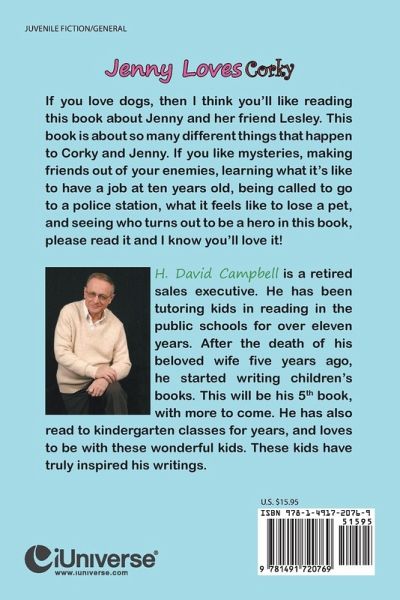 If you love dogs, then I think you'll like reading this book about Jenny and her friend Lesley. This book is about so many different things that happen to Corky and Jenny. If you like mysteries, making friends out of your enemies, learning what it's like to have a job at ten years old, being called to go to a police station, what it feels like to lose a pet, and seeing who turns out to be a hero in this book, please read it and I know you'll love it!