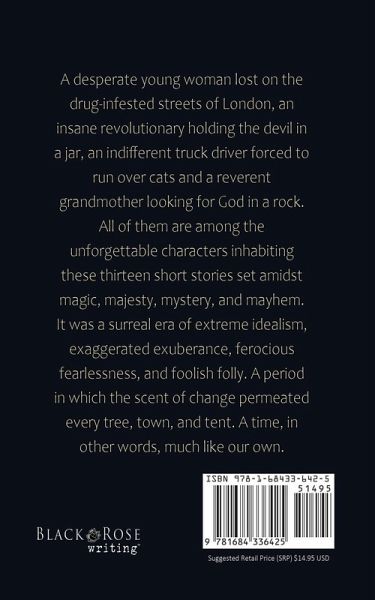 A desperate young woman lost on the drug-infested streets of London, an insane revolutionary holding the devil in a jar, an indifferent truck driver forced to run over cats and a reverent grandmother looking for God in a rock. All of them are among the unforgettable characters inhabiting these thirteen short stories set amidst magic, majesty, mystery, and mayhem. It was a surreal era of extreme idealism, exaggerated exuberance, ferocious fearlessness, and foolish folly. A period in which the scent of change permeated every tree, town, and tent. A time, in other words, much like our own.