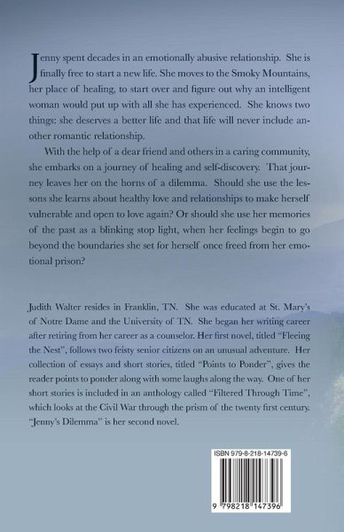 Jenny spent decades in an emotionally abusive relationship. She is finally free to start a new life. She moves to the Smoky Mountains, her place of healing, to start over and figure out why an intelligent woman would put up with all she has experienced. With the help of a dear friend, a therapist, and a caring community she embarks on a journey of healing and self-discovery. That journey leaves Jenny on the horns of a dilemma. Should she use the lessons she has learned about healthy love and relationships to make herself vulnerable and open to love again? Or should she use her memories of the past as a blinking stop light when her feelings begin to go beyond the boundaries she had set for herself? Helping a young woman get out of an abusive relationship helps Jenny to clarify her thoughts. Will she take a chance again or choose to live her life alone and safe from hurt?