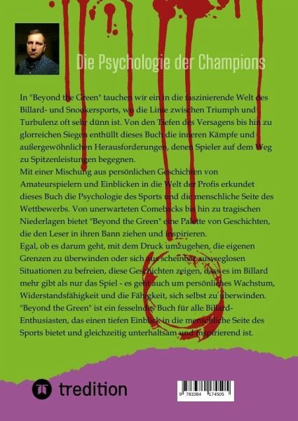 In "Jenseits des Grüns" geht es um die faszinierende Welt des Billard- und Snookersports und die psychologischen Herausforderungen, denen Spieler auf ihrem Weg zu Spitzenleistungen begegnen. Das Buch erkundet die menschliche Seite des Wettbewerbs und beleuchtet die inneren Kämpfe, Triumphmomente und Rückschläge, die Spieler erfahren. Es bietet eine Sammlung von Geschichten von Amateurspielern und Einblicken in die Welt der Profis, die den Leser in ihren Bann ziehen und inspirieren sollen. Von unerwarteten Comebacks bis hin zu tragischen Niederlagen zeigt "Jenseits des Grüns", dass der Billard- und Snookersport nicht nur ein Spiel, sondern auch eine Reise des persönlichen Wachstums, der Widerstandsfähigkeit und der Selbstüberwindung ist.