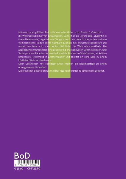Mit einem prall gefüllten Sack voller erotischer Gaben spitzt Santa I.Q. Odenthal in die Weihnachtszimmer von Erwachsenen. Da trifft er die Psychologie-Studentin in ihrem Badezimmer, begleitet zwei Sängerinnen in ein Hotelzimmer, erfreut sich am weihnachtlichen Treiben seiner Nachbarn durch die hell erleuchtete Balkontüre und nimmt den Leser mit in ein Wohnmobil hinter der Weihnachtsmarktbude. Die abgegebenen Wunschzettel sind gespickt mit phantasievollen Begehrlichkeiten. Und Santa packt ein Päckchen für zwei befreundete Pärchen im Schlafzimmer, wickelt ein besonderes Heiligenbild in Geschenkpapier und bereitet ein blind Date zu einem köstlichen Weihnachtsschmaus. Neun Geschichten mit lebendiger Erotik machen die Dezembertage zu einem unvergessenen Liebesfest. Die erotischen Beschreibungen sind für Jugendliche unter 18 Jahren nicht geeignet.