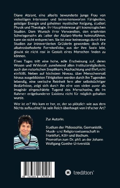 Wer ist er? Wo kam er her, er, der so plötzlich wie aus dem Nichts auftauchte? Ist sein Reich überhaupt von ird'scher Art?Diane Atalant, eine allseits bewunderte junge Frau von vielseitigen Interessen und bemerkenswerten Fähigkeiten, geistiger Energie und geheimer mystischer Neigung, studiert Physik und Theologie. Ihr Hauptinteresse gilt kosmologischen Studien. Dem Wunsch ihrer Verwandten, den ersehnten Schwiegersohn als Leiter der Atalant-Werke heimzuführen, kann sie nicht entsprechen. Sie ist zwar keineswegs durch ihre Studien zur introvertierten Grüblerin geworden, ist rundum die beliebte humorvolle und geschätzte Kommilitonin; doch die albatrosbefiederte Fernstenliebe, aus der ihre Seele lebt, glaubt sie nicht real in Gestalt eines Menschen finden zu können.Eines Tages tritt eine hohe, edle Erscheinung auf, deren Wesen und Wirkkraft zunehmend allen Institutsmitgliedern, auch den notorischen Skeptikern, Hochachtung und Ehrfurcht einflößt. Neben auf höchstem Niveau, über Menschenmaß hinaus ausgebildeten Fähigkeiten werden durch ihn Tugenden lebendig, eine seelische Reinheit fern aller selbstsüchtiger Bedürfnisse, zeigt sich durch ihn eine von vielen zuvor als imaginär eingeschätzte Tugend des Menschseins, die nicht im Rahmen erdgebundener Existenz für möglich gehalten wurde.