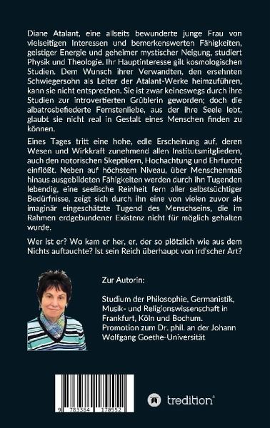 Wer ist er? Wo kam er her, er, der so plötzlich wie aus dem Nichts auftauchte? Ist sein Reich überhaupt von ird'scher Art?Diane Atalant, eine allseits bewunderte junge Frau von vielseitigen Interessen und bemerkenswerten Fähigkeiten, geistiger Energie und geheimer mystischer Neigung, studiert Physik und Theologie. Ihr Hauptinteresse gilt kosmologischen Studien. Dem Wunsch ihrer Verwandten, den ersehnten Schwiegersohn als Leiter der Atalant-Werke heimzuführen, kann sie nicht entsprechen. Sie ist zwar keineswegs durch ihre Studien zur introvertierten Grüblerin geworden, ist rundum die beliebte humorvolle und geschätzte Kommilitonin; doch die albatrosbefiederte Fernstenliebe, aus der ihre Seele lebt, glaubt sie nicht real in Gestalt eines Menschen finden zu können.Eines Tages tritt eine hohe, edle Erscheinung auf, deren Wesen und Wirkkraft zunehmend allen Institutsmitgliedern, auch den notorischen Skeptikern, Hochachtung und Ehrfurcht einflößt. Neben auf höchstem Niveau, über Menschenmaß hinaus ausgebildeten Fähigkeiten werden durch ihn Tugenden lebendig, eine seelische Reinheit fern aller selbstsüchtiger Bedürfnisse, zeigt sich durch ihn eine von vielen zuvor als imaginär eingeschätzte Tugend des Menschseins, die nicht im Rahmen erdgebundener Existenz für möglich gehalten wurde.