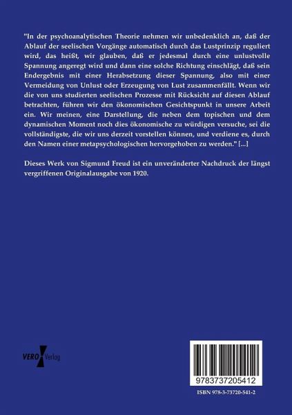"In der psychoanalytischen Theorie nehmen wir unbedenklich an, daß der Ablauf der seelischen Vorgänge automatisch durch das Lustprinzip reguliert wird, das heißt, wir glauben, daß er jedesmal durch eine unlustvolle Spannung angeregt wird und dann eine solche Richtung einschlägt, daß sein Endergebnis mit einer Herabsetzung dieser Spannung, also mit einer Vermeidung von Unlust oder Erzeugung von Lust zusammenfällt. Wenn wir die von uns studierten seelischen Prozesse mit Rücksicht auf diesen Ablauf betrachten, führen wir den ökonomischen Gesichtspunkt in unsere Arbeit ein. Wir meinen, eine Darstellung, die neben dem topischen und dem dynamischen Moment noch dies ökonomische zu würdigen versuche, sei die vollständigste, die wir uns derzeit vorstellen können, und verdiene es, durch den Namen einer metapsychologischen hervorgehoben zu werden." [...]