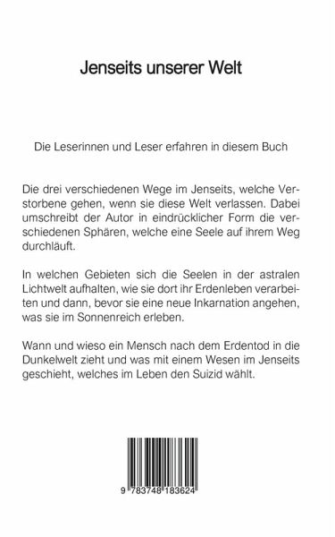 2. AuflageDie Leserinnen und Leser erfahren in diesem BuchDie 3 verschiedenen Wege im Jenseits, welche Verstorbene gehen, wenn sie diese Welt verlassen. Dabei umschreibt der Autor in eindrücklicher Form die verschiedenen Sphären, welche ein Seelenwesen auf seinem Weg durchläuft.In welchen Gebieten sich die Verstorbenen in der astralen Lichtwelt aufhalten, wie sie dort ihr Erdenleben verarbeiten und dann, bevor sie eine neue Inkarnation angehen, was sie im Sonnenreich erleben.Wann und wieso ein Mensch nach dem Erdentod in die Dunkelwelt zieht und was mit einem Menschen im Jenseits geschieht, welcher im Leben den Suizid wählt.
