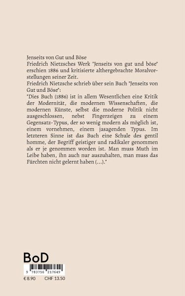 Jenseits von Gut und BöseFriedrich Nietzsches Werk "Jenseits von gut und böse" erschien 1886 und kritisierte althergebrachte Moralvorstellungen seiner Zeit. Friedrich Nietzsche schrieb über sein Buch "Jenseits von Gut und Böse": "Dies Buch (1886) ist in allem Wesentlichen eine Kritik der Modernität, die modernen Wissenschaften, die modernen Künste, selbst die moderne Politik nicht ausgeschlossen, nebst Fingerzeigen zu einem Gegensatz-Typus, der so wenig modern als möglich ist, einem vornehmen, einem jasagenden Typus. Im letzteren Sinne ist das Buch eine Schule des gentil homme, der Begriff geistiger und radikaler genommen als er je genommen worden ist. Man muss Muth im Leibe haben, ihn auch nur auszuhalten, man muss das Fürchten nicht gelernt haben (...)."