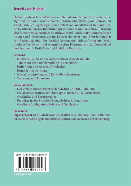 Öngün Eryilmaz beschäftigt sich mit Raumkonzepten im cinéma du métissage und der daraus resultierenden filmischen Darstellung von Heimat und soziokultureller Zugehörigkeit im Kontext von Mobilität und transkulturellen Gesellschaften. Die Betrachtungen stützen sich dazu sowohl auf Theorien über filmisches Raumdenken als auch auf sozial- und kulturwissenschaftliche Ansätze und Positionen, die im Kontext der Inter- und Transkulturalität von Bedeutung sind. Die Analyse konzentriert sich auf insgesamt sechs filmische Werke von zwei zeitgenössischen Filmemachern aus Deutschland und Frankreich: Fatih Akin und Abdellatif Kechiche.