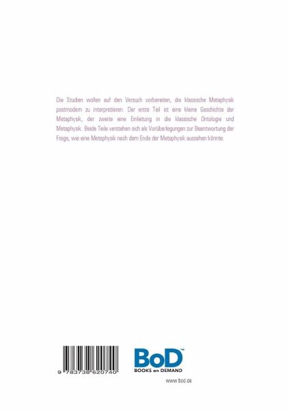 Die Studien wollen auf den Versuch vorbereiten, die klassische Metaphysik postmodern zu interpretieren. Der erste Teil ist eine kleine Geschichte der Metaphysik, der zweite eine Einleitung in die klassische Ontologie und Metaphysik. Beide Teile verstehen sich als Vorüberlegungen zur Beantwortung der Frage, wie eine Metaphysik nach dem Ende der Metaphysik aussehen könnte.