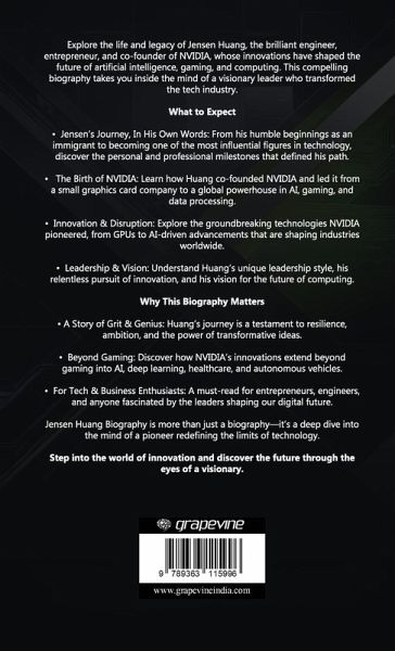 Explore the life and legacy of Jensen Huang, the brilliant engineer, entrepreneur, and co-founder of NVIDIA, whose innovations have shaped the future of artificial intelligence, gaming, and computing. This compelling biography takes you inside the mind of a visionary leader who transformed the tech industry. What to Expect: ¿ Jensen's Journey, In His Own Words: From his humble beginnings as an immigrant to becoming one of the most influential figures in technology, discover the personal and professional milestones that defined his path. ¿ The Birth of NVIDIA: Learn how Huang co-founded NVIDIA and led it from a small graphics card company to a global powerhouse in AI, gaming, and data processing. ¿ Innovation & Disruption: Explore the groundbreaking technologies NVIDIA pioneered, from GPUs to AI-driven advancements that are shaping industries worldwide. ¿ Leadership & Vision: Understand Huang's unique leadership style, his relentless pursuit of innovation, and his vision for the future of computing. Why This Biography Matters: ¿ A Story of Grit & Genius: Huang's journey is a testament to resilience, ambition, and the power of transformative ideas. ¿ Beyond Gaming: Discover how NVIDIA's innovations extend beyond gaming into AI, deep learning, healthcare, and autonomous vehicles. ¿ For Tech & Business Enthusiasts: A must-read for entrepreneurs, engineers, and anyone fascinated by the leaders shaping our digital future. ¿ Jensen Huang Biography: The Visionary Engineer Who Revolutionized AI and Gaming - The Way of Nvidia is more than just a biography-it's a deep dive into the mind of a pioneer redefining the limits of technology. Step into the world of innovation and discover the future through the eyes of a visionary.
