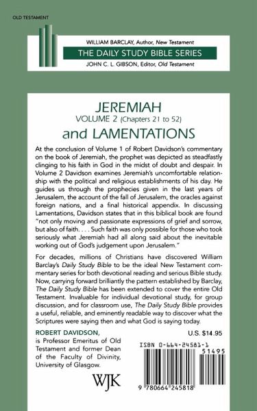 Robert Davidson delves into Jeremiah's relationship with his era's political and religious powers, exploring his enduring faith and the prophecies concerning Jerusalem's fall, oracles against foreign nations, and the prophet's Lamentations. At the conclusion of Volume 1 of Robert Davidson's commentary on the book of Jeremiah, the prophet is depicted as steadfastly clinging to his faith in God in the midst of doubt and despair. In this volume Robert Davidson examines Jeremiah's uncomfortable relationship with the political and religious establishments of his day. He guides us through the prophecies given in the last years of Jerusalem, the account of the fall of Jerusalem, the oracles against foreign nations, and a final historical appendix. In discussing Lamentations, Davidson states that in this biblical book are found "not only moving and passionate expressions of grief and sorrow, but also of faith... Such faith was only possible for those who took seriously what Jeremiah had all along said about the inevitable working out of God's judgment upon Jerusalem." The Daily Study Bible series seamlessly continues the legacy of William Barclay's renowned New Testament series by delving into the texts of the Old Testament, weaving together ancient wisdom and modern insights for a transformative reading experience. Perfectly tailored for individual study, spirited group discussions, or classroom exploration, the Daily Study Bible series offers an indispensable resource for spiritual seekers and scholars alike. Within these volumes, readers will encounter a profound exploration of the Scriptures, uncovering the profound messages they held in the past and discerning their relevance in the present.