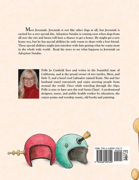 Meet Jeremiah. Jeremiah is not like other dogs at all, but Jeremiah is excited for a very special day. Adoption Sunday is coming soon when dogs from all over the city and farms will have a chance to get a home. He might get a new home too, but he has special abilities he only wants to share with a best friend. These special abilities might just interfere with him getting what he wants most in the whole wide world. Read the story to see what happens to Jeremiah on Adoption Sunday. Polly Jo Canfield lives and writes in the sunny state of California, and is the proud owner of two turtles, Mert, and Little T, and a hazel-eyed Labrador named Katie. She and her husband love to travel, and on one trip through the Alps, Polly is sure to have met the real Santa Claus! Polly's professional career involved the designing of medical, commercial, and residential projects, business owner, and as a nursing instructor. She enjoys singing, painting, acting in community theater, and missions ministries.