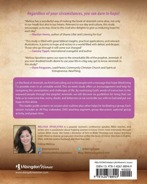 When we look around at today's world, hope usually isn't the first word that comes to mind. In many ways we live in an unstable world where marriages fail, bank accounts run low, friendships end, and the everyday demands of a fast-paced life get us down. In the Book of Jeremiah, we find God calling out to His people with a message of hope--a message that intentional living is possible even in an unstable world. But how do we do this? Where do we start? Jeremiah offers women hope for living in an uncertain world by learning to navigate the challenges and circumstances of their lives. This six-week study examines God's words of instruction to His wayward people through the prophet Jeremiah, and provides women six guidelines for intentional living to overcome fear, worry, and doubt as they surrender their wills to God's and put their hope in Him alone. Combining rich study of the Book of Jeremiah with practical life application that resonates with the realities and experiences of today's women, this study inspires all women to dare to hope, remembering that God is rich in mercy and love and has good plans for us. The Leader Guide contains six session plan outlines, complete with discussion points and questions, activities, prayers, and more--plus leader helps for facilitating a group.