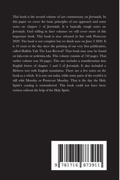 This book is the second volume of our commentary on Jeremiah. In this paper we cover the basic principles of our approach and some notes on chapter 1 of Jeremiah. It is basically rough notes on Jeremiah. God willing in later volumes we will cover more of this important book. This book is now released in line with Pentecost 2020. The book is not complete but we finish now on June 2 2020. It is 19 years to the day since the printing of our very first publication, called Hallelu Yah The Last Revival? That book may now be found on lulu.com or acdemia.edu. This volume consists of 150 pages. That earlier volume was 50 pages. This one includes a transliteration into English letters of chapter 1 and 2 of Jeremiah. It also included a Hebrew text with English translation. There are a few notes on the book as a whole. It is sent out today while some parts of the world it is still whit Monday or Pentecost Monday. That is the day the Holy Spirit's coming is remembered. This book could not have been written without the help of the Holy Spirit.