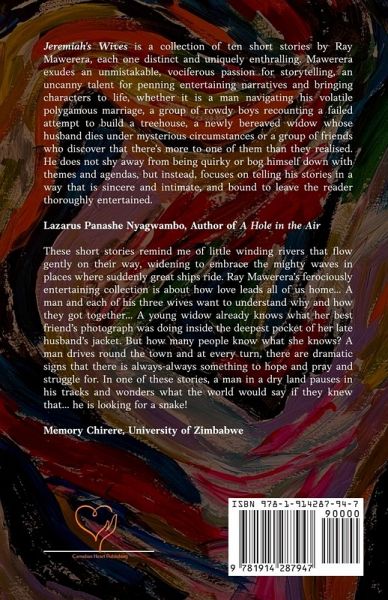 Jeremiah's Wives is a collection of ten short stories by Ray Mawerera, each one distinct and uniquely enthralling. Mawerera exudes an unmistakable, vociferous passion for storytelling, an uncanny talent for penning entertaining narratives and bringing characters to life, whether it is a man navigating his volatile polygamous marriage, a group of rowdy boys recounting a failed attempt to build a treehouse, a newly bereaved widow whose husband dies under mysterious circumstances or a group of friends who discover that there's more to one of them than they realised. He does not shy away from being quirky or bog himself down with themes and agendas, but instead, focuses on telling his stories in a way that is sincere and intimate, and bound to leave the reader thoroughly entertained.Lazarus Panashe Nyagwambo, Author of A Hole in the AirThese short stories remind me of little winding rivers that flow gently on their way, widening to embrace the mighty waves in places where suddenly great ships ride. Ray Mawerera's ferociously entertaining collection is about how love leads all of us home... A man and each of his three wives want to understand why and how they got together... A young widow already knows what her best friend's photograph was doing inside the deepest pocket of her late husband's jacket. But how many people know what she knows? A man drives round the town and at every turn, there are dramatic signs that there is always-always something to hope and pray and struggle for. In one of these stories, a man in a dry land pauses in his tracks and wonders what the world would say if they knew that... he is looking for a snake! Memory Chirere, University of Zimbabwe