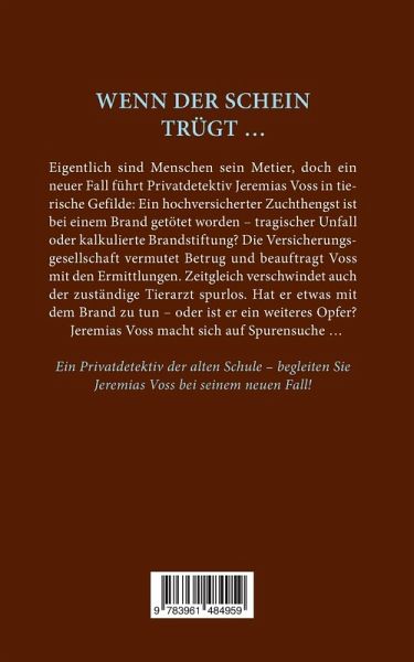 Jahrelang hat sich Tierarzt Dr. Bertram Rusinski um das Wohl…mehr"Jeremias Voss und der tote Hengst“, ist der zweite Fall des sympathischen Hamburger Privatdetektiv, den es diesmal im Auftrag einer grossen renommierten Versicherung, auf ein Schloss mit gräflichen Gestüt verschlägt, die bei einem tragischen Brand oder kalkulierte Brandstiftung bitterlich verbrannt sind, geschrieben von Ole Hansen.