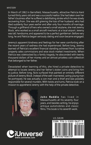 In March of 1982 in Barnsfield, Massachusetts, attractive Patricia Kent turned thirty years old and was a successful realtor. She had taken over her father's business after he suffered a debilitating stroke which he was slowly recovering from. She was still grieving the loss of her husband, who had died suddenly four years earlier and after only four months of marriage. Through a girlfriend of hers who owned a small airplane, she met Jeremy Block, who worked as a small aircraft mechanic at a local airport. Jeremy was tall, handsome, and appeared to be a perfect gentleman. Before very long, he and Patricia began seriously dating and soon became engaged. Jeremy's apparent kindness and feelings for her were comforting after the recent years of sadness she had experienced. Before long, Jeremy learned of Patricia's excellent financial standing achieved from lucrative property sales commissions and wise stock market investments. When Patricia was sidetracked by a family tragedy, he absconded with twenty thousand dollars of her money and an almost priceless coin collection that belonged to her father. Devastated when learning of this, she hired a private detective to attempt to locate Jeremy and her father's stolen coins and bring him to justice. Before long, facts surfaced that painted an entirely different picture of Jeremy Block. Instead of the well-mannered, caring young man he portrayed, he was actually a con man and a thief and was possibly responsible for several murders. With twists and turns, Patricia took on a mission to apprehend Jeremy with the help of the private detective.
