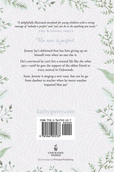 No one is perfect. Jeremy Jay's deformed foot has him giving up on himself even when no one else is. He's convinced he can't live a normal life like the other jays-until he gets the support of the oldest friend to every animal in Oakwoods. Soon, Jeremy is singing a new tune, but can he go from doubter to teacher when he meets another impaired blue jay? This is book one of the Oakwoods series of early reader chapter books featuring under-appreciated woodland animals. Perfect for young readers transitioning from picture to chapter books. Features include: Sassoon Primary font - a proven easy-to-read font for beginning readers. Internal thoughts of the main character printed in color. (Useful for very early or struggling readers. They can read those while you read the rest aloud.) Children love color. Beautiful full-color illustrations with a hidden creature to find. "What If?" discussion questions. Some about the story, and others for application to real life. A glossary for new words. "Did You Know?" section with facts about the real animal. In this story you'll learn about the blue jay.
