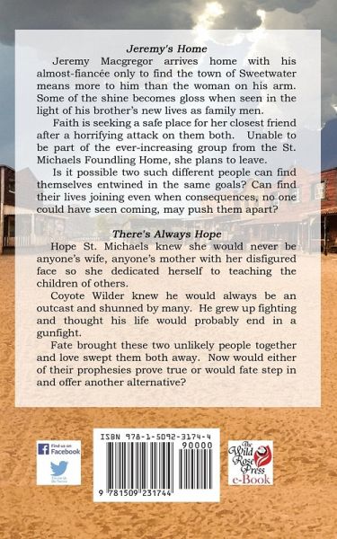 Jeremy's Home Jeremy Macgregor arrived home with his almost-fiancée only to find the town of Sweetwater means more to him then the woman on his arm. Some of the shine becomes gloss when seen in the light of his brother's new lives as family men. Realizing in time his real ambitions, Jeremy decides to stay in Sweetwater and help in its potential to prosperity. Something he is placing all his aspirations on. Faith is seeking a safe place for her closest friend after a horrifying attack on them both. Knowing Charity will be safe with Callie Harrison, Faith prepares herself to continue on in life alone. Unable to be part of the ever-increasing group of graduates from the St. Michaels Foundling Home gathering near Sweetwater, Kansas. Is it possible two such different people can find themselves entwined in the same goals? Can find their lives meeting and joining even when consequences no one could have seen coming may push them apart? There's Always Hope Hope St. Michaels dedicated her life to teaching. Knowing she would never marry and have children of her own, she wanted to repay what she felt she had received from the nuns at New York's St. Michaels Foundling Home. Having been asked to become the new teacher for Sweetwater, Kansas, where so many of her fellow orphans were living was more than she could ever imagine. She knew she would be welcomed and accepted by those already familiar with her disfigurement. Bounty hunter, Coyote Wilder, felt a twinge of regret for placing an unaware and unsuspecting young lady in a position of danger. But he needed to recapture a desperate criminal who would wreak havoc on hundreds of others. Possibly going on for another ten years before being captured again. He would need to protect her while waiting for the dangerous felon. Two people from such different worlds meet and together find the freedom neither thought they would ever have to be themselves. To find love and make amends for past misjudgments.