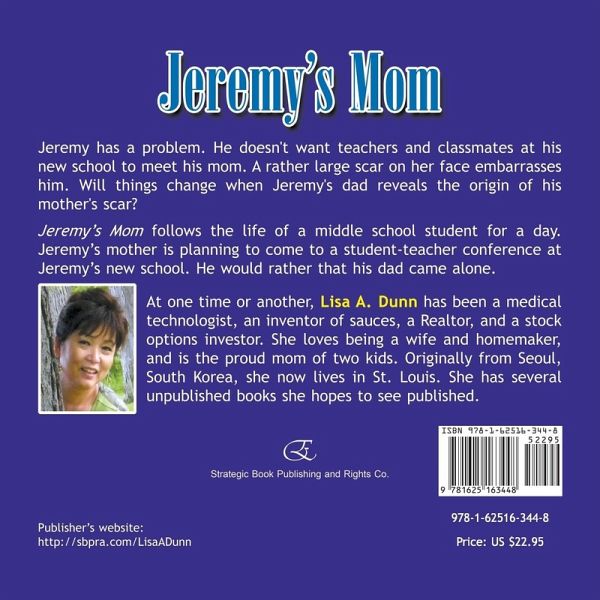 Jeremy has a problem. He doesn't want teachers and classmates at his new school to meet his mom. A rather large scar on her face embarrasses him. Will things change when Jeremy's dad reveals the origin of his mother's scar? Jeremy's Mom follows the life of a middle school student for a day. Jeremy's mother is planning to come to a student-teacher conference at Jeremy's new school. He would rather that his dad came alone. At one time or another, Lisa A. Dunn has been a medical technologist, an inventor of sauces, a Realtor, and a stock options investor. She loves being a wife and homemaker, and is the proud mom of two kids. Originally from Seoul, South Korea, she now lives in St. Louis. She has several unpublished books she hopes to see published. Publisher's website: http://sbpra.com/LisaADunn