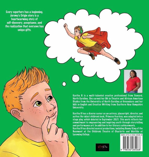 Every superhero has a beginning. Jeremy's Origin Story is a heartwarming story of self-discovery, acceptance, and the realization that everyone has unique gifts. Lakeetha Blakeney is a multi-talented creative professional from Concord, North Carolina. She earned her BA in Theatre and African American Studies from the University of North Carolina at Greensboro and her MA in English and Creative Writing from Southern New Hampshire University. Blakeney has a diverse career as an actress, playwright, director, and author. Her debut children's book, Princess Fearless, was adapted into a stage play, which debuted in September 2021. This work reflects her commitment to empowering and inspiring youth through storytelling and performance art. In addition to her literary achievements, Blakeney has directed several productions, including Danny King of the Basement at the Children's Theatre of Charlotte and Matilda at Lycoming College.