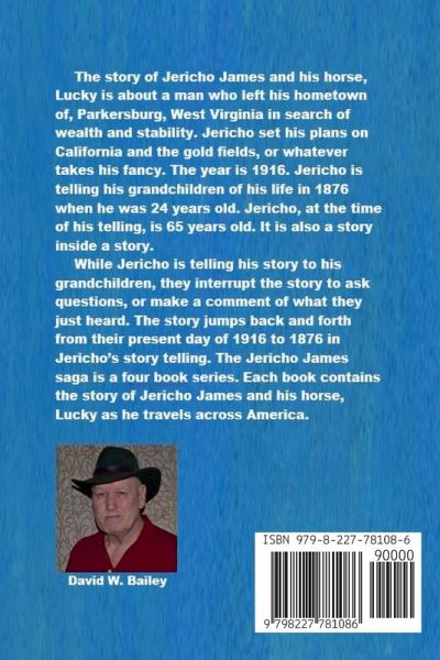 The story of Jericho James and his horse, Lucky is about a man who left his hometown of Parkersburg, West Virginia in search of wealth and stability. Jericho set his plans on California and the gold fields, or whatever takes his fancy. The year is 1916. Jericho is telling his grandchildren of his life in 1876 when he was 24 years old. Jericho, at the time of his telling, is 65 years old. It is also a story inside a story. While Jericho is telling his story to his grandchildren, they interrupt the story to ask questions, or make a comment of what they just heard. The story jumps back and forth from their present day of 1916 to 1876 in Jericho's story telling. The Jericho James saga is a four book series. Each book contains the story of Jericho James and his horse, Lucky as he travels across America.