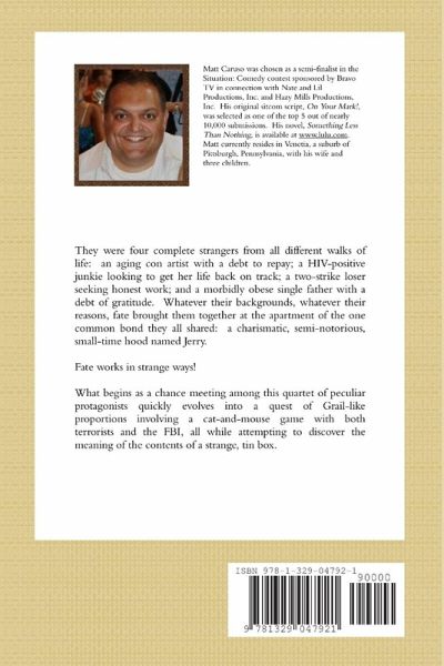 They were four complete strangers from all different walks of life: an aging con artist with a debt to repay; a HIV-positive junkie looking to get her life back on track; a two-strike loser seeking honest work; and a morbidly obese single father with a debt of gratitude. Whatever their backgrounds, whatever their reasons, fate brought them together at the apartment of the one common bond they all shared: a charismatic, semi-notorious, small-time hood named Jerry. Fate works in strange ways! What begins as a chance meeting among this quartet of peculiar protagonists quickly evolves into a quest of Grail-like proportions involving a cat-and-mouse game with both terrorists and the FBI, all while attempting to discover the meaning of the contents of a strange, tin box.