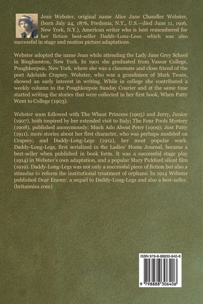 Wow. This is the funnest book ever! Ups, downs, and complete turn-arounds! This book is plot-twisty and a lot of fun to read. A LOT of fun to read. (Reviewer) About the author: Jean Webster, original name Alice Jane Chandler Webster, (born July 24, 1876, Fredonia, N.Y., U.S.-died June 11, 1916, New York, N.Y.), American writer who is best remembered for her fiction best-seller Daddy-Long-Legs, which was also successful in stage and motion picture adaptations. Webster adopted the name Jean while attending the Lady Jane Grey School in Binghamton, New York. In 1901 she graduated from Vassar College, Poughkeepsie, New York, where she was a classmate and close friend of the poet Adelaide Crapsey. Webster, who was a grandniece of Mark Twain, showed an early interest in writing. While in college she contributed a weekly column to the Poughkeepsie Sunday Courier and at the same time started writing the stories that were collected in her first book, When Patty Went to College (1903). Webster soon followed with The Wheat Princess (1905) and Jerry, Junior (1907), both inspired by her extended visit to Italy; The Four Pools Mystery (1908), published anonymously; Much Ado About Peter (1909); Just Patty (1911), more stories about her first character, who was perhaps modeled on Crapsey; and Daddy-Long-Legs (1912), her most popular work. Daddy-Long-Legs, first serialized in the Ladies' Home Journal, became a best-seller when published in book form. It was a successful stage play (1914) in Webster's own adaptation, and a popular Mary Pickford silent film (1919). Daddy-Long-Legs was not only a successful piece of fiction but also a stimulus to reform the institutional treatment of orphans. In 1914 Webster published Dear Enemy, a sequel to Daddy-Long-Legs and also a best-seller. (britannica.com)
