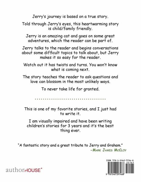 Jerry's journey is based on a true story. Told through Jerry's eyes, this heartwarming story is child/family friendly. Jerry is an amazing cat and goes on some great adventures, which the reader can be part of. Jerry talks to the reader and begins conversations about some difficult topics to talk about, but Jerry makes it so easy for the reader. Watch out it has twists and turns. You won't know what is coming next. The story teaches the reader to ask questions and love can blossom in the most unlikely ways. To never take life for granted.