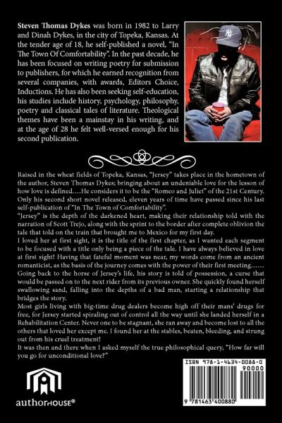 Raised in the wheat fields of Topeka, Kansas, "Jersey" takes place in the hometown of the author, Steven Thomas Dykes; bringing about an undeniable love for the lesson of how love is defined....He considers it to be the "Romeo and Juliet" of the 21st Century. Only his second short novel released, eleven years of time have passed since his last self-publication of "In The Town of Comfortability". "Jersey" is the depth of the darkened heart, making their relationship told with the narration of Scott Trejo, along with the sprint to the border after complete oblivion the tale that told on the train that brought me to Mexico for my first day. I loved her at first sight, it is the title of the first chapter, as I wanted each segment to be focused with a title only being a piece of the tale. I have always believed in love at first sight! Having that fateful moment was near, my words come from an ancient romanticist, as the basis of the journey comes with the power of their first meeting......Going back to the horse of Jersey's life, his story is told of possession, a curse that would be passed on to the next rider from its previous owner. She quickly found herself swallowing sand, falling into the depths of a bad man, starting a relationship that bridges the story. Most girls living with big-time drug dealers become high off their mans' drugs for free, for Jersey started spiraling out of control all the way until she landed herself in a Rehabilitation Center. Never one to be stagnant, she ran away and become lost to all the others that loved her except me. I found her at the stables, beaten, bleeding, and strung out from his cruel treatment! It was then and there when I asked myself the true philosophical query, "How far will you go for unconditional love?"