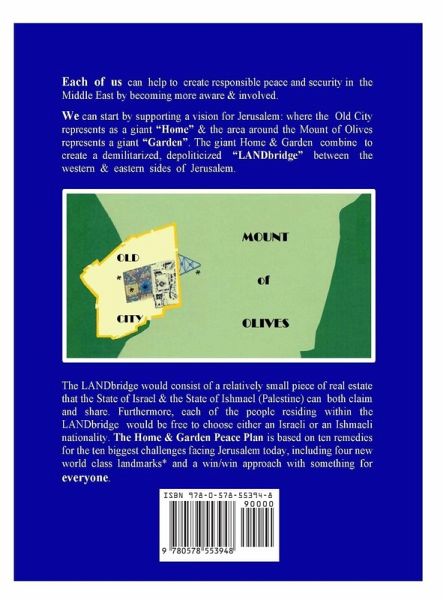 JERUSALEM 2020 proposes that people worldwide help to create a "New Deal" in the Middle East by becoming more aware & involved. This ethical & compassionate, win-win agreement would employ, encourage & teach the principles of peace, wellness, truth, reconciliation & sustainability on a daily basis. IMAGINE the Old City of Jerusalem as a giant "Home" & the Mt. of Olives as a giant "Garden". The Home & Garden combine to create an exciting, new opportunity & a new chapter as a "LANDbridge" (significantly widening the Green Line and the buffer zone) between East & West Jerusalem. The Home & Garden Peace Plan is based on forward thinking, mutual understandings, sociopolitical realities as well as sensitivities to geography & nature. The LANDbridge would consist of a relatively small piece of real estate that two states: the State of Israel & the State of Ishmael (Palestine) can share & claim. Instead of fighting over the land or forcing religious / political beliefs upon anyone, each of the people residing within this demilitarized, depoliticized LANDbridge would be free to express their nationality & beliefs.
