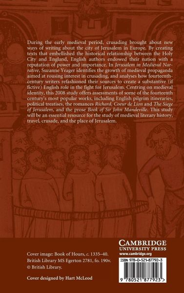 During the early medieval period, crusading brought about new ways of writing about the city of Jerusalem in Europe. By creating texts that embellished the historical relationship between the Holy City and England, English authors endowed their nation with a reputation of power and importance. In Jerusalem in Medieval Narrative, Suzanne Yeager identifies the growth of medieval propaganda aimed at rousing interest in crusading, and analyses how fourteenth-century writers refashioned their sources to create a substantive (if fictive) English role in the fight for Jerusalem. Centring on medieval identity, this study offers assessments of some of the fourteenth century's most popular works, including English pilgrim itineraries, political treatises, the romances Richard, Coeur de Lion and The Siege of Jerusalem, and the prose Book of Sir John Mandeville. This study will be an essential resource for the study of medieval literary history, travel, crusade, and the place of Jerusalem.