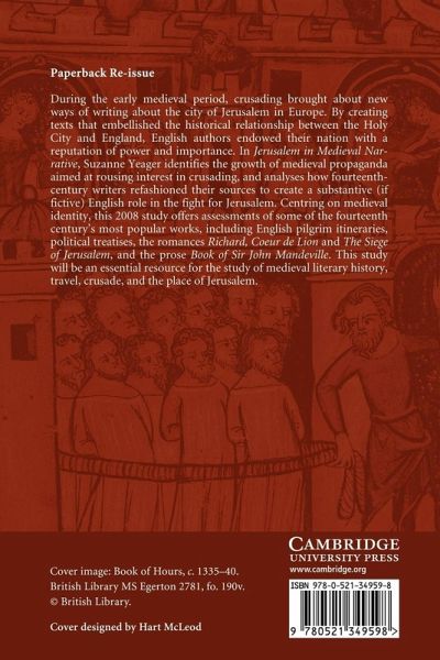During the early medieval period, crusading brought about new ways of writing about the city of Jerusalem in Europe. By creating texts that embellished the historical relationship between the Holy City and England, English authors endowed their nation with a reputation of power and importance. In Jerusalem in Medieval Narrative, Suzanne Yeager identifies the growth of medieval propaganda aimed at rousing interest in crusading, and analyses how fourteenth-century writers refashioned their sources to create a substantive (if fictive) English role in the fight for Jerusalem. Centring on medieval identity, this study offers assessments of some of the fourteenth century's most popular works, including English pilgrim itineraries, political treatises, the romances Richard, Coeur de Lion and The Siege of Jerusalem, and the prose Book of Sir John Mandeville. This study will be an essential resource for the study of medieval literary history, travel, crusade, and the place of Jerusalem.