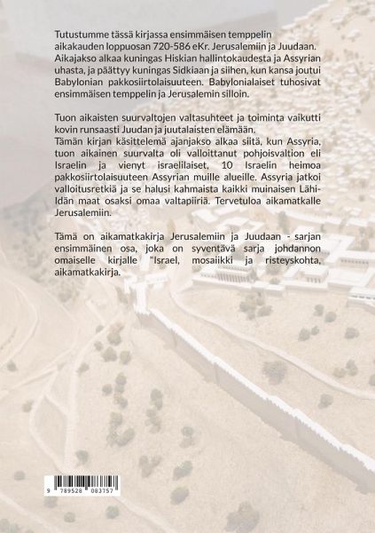 Aikamatkakirja Israeliin ja Jerusalemiin -sarjan ensimmäinen osa käsittelee aikajaksoa 720-586 eKr. Teokratia vallitsi, kuninkaan valitsema tie oli koko kansan tie, ja seuraukset olivat myös kollektiivisia. Kirjassa tutustumme Raamatun ja jossain määrin arkeologian löytöjen valossa Jerusalemin historiaan. Aikajakso alkaa Hiskiasta ja päättyy n. 120 vuotta myöhemmin eläneeseen Sidkiaan. Myös tuon aikaisten suurvaltojen valtasuhteet ja toiminta vaikutti kovin runsaasti Juudan ja juutalaisten elämään. Tämän kirjan käsittelemä ajanjakso alkaa siitä, kun Assyria, tuon aikainen suurvalta oli valloittanut pohjoisvaltion eli Israelin ja vienyt israelilaiset, 10 Israelin heimoa pakkosiirtolaisuuteen Assyrian muille alueille. Assyria jatkoi valloitusretkiä ja se halusi kahmaista kaikki muinaisen Lähi-Idän maat osaksi omaa valtapiiriä. Tervetuloa aikamatkalle Jerusalemiin.