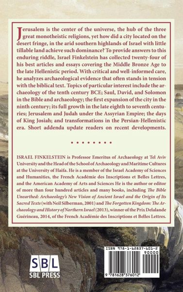 Jerusalem is the center of the universe, the hub of the three great monotheistic religions, yet how did a city located on the desert fringe, in the semi-arid southern highlands of Israel with little tillable land achieve such dominance? To provide answers to this enduring riddle, Israel Finkelstein has collected twenty-four of his best articles and essays covering the Middle Bronze Age to the late Hellenistic period. With critical and well-informed care, he analyzes archaeological evidence that often stands in tension with the biblical text. Topics of particular interest include the archaeology of the tenth century BCE; Saul, David, and Solomon in the Bible and archaeology; the first expansion of the city in the ninth century; its full growth in the late eighth to seventh centuries; Jerusalem and Judah under the Assyrian Empire; the days of King Josiah; and transormations in the Persian-Hellenistic era.