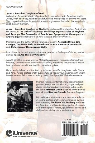 Jesica - Sanctified Daughter of God is about an American rebirth of cultural faith, particularly with America's youth. Jesica, even as a baby, exhibits an aptitude and intelligence far beyond her years. This coupled with specific and divine actions gives one the belief that angels do exist, even in the flesh. Jesica - Sanctified Daughter of God is the sixth novel from Michael André Fath. His previous: The Girls of Yesterday; The Village Squires - Tales of Mayhem and Revenge; The Conversion of Ronnie Vee; Symphony for the Angels; and Arc of a Squire continue to gain new fans and praise everywhere. Michael is also the author of five volumes of poetry: Aesthetic Divine; Life Changes, Yet Never Ends; 28 Benedizioni di Rita; Amor est Conceptualis; and, Reflections of Darkness and Light. In addition, he has written a motivational treatise on finding one's inner creative genius: Faces Are Three of Virtuosity. As with all of his creative writing, Michael passionately recognizes his Southern heritage, spirituality and philosophy-faithfully embracing the provincial nature, heart and soul found there in all its marvelous guises. He is clearly defined and inspired by his three beautiful daughters, Jade, Sierra and Paris. All are professionally successful and happy young women with whom he continues to fall in love on a daily basis. Proof positive of God's existence.