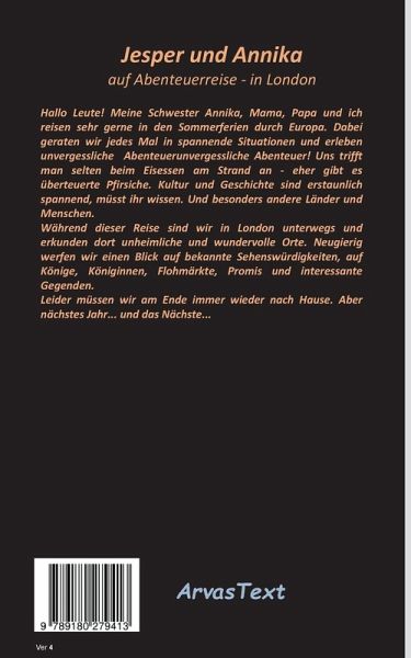 Hallo Leute! Meine Schwester Annika, Mama, Papa und ich reisen sehr gerne in den Sommerferien durch Europa. Dabei geraten wir jedes Mal in spannende Situationen und erleben unvergessliche Abenteuerunvergessliche Abenteuer! Uns trifft man selten beim Eisessen am Strand an - eher gibt es überteuerte Pfirsiche. Kultur und Geschichte sind erstaunlich spannend, müsst ihr wissen. Und besonders andere Länder und Menschen. Während dieser Reise sind wir in London unterwegs und erkunden dort unheimliche und wundervolle Orte. Neugierig werfen wir einen Blick auf bekannte Sehenswürdigkeiten, auf Könige, Königinnen, Flohmärkte, Promis und interessante Gegenden. Leider müssen wir am Ende immer wieder nach Hause. Aber nächstes Jahr... und das Nächste...
