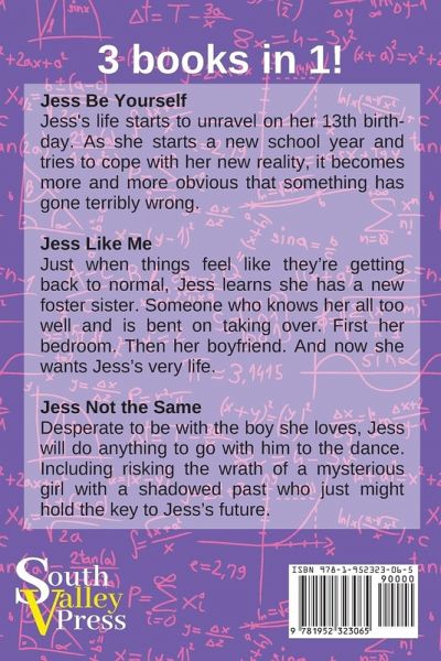 3 books in one volume! Jess Be Yourself Jess's life starts to unravel on her 13th birthday. As she starts a new school year and tries to cope with her new reality, it becomes more and more obvious that something has gone terribly wrong. Jess Like Me Just when things feel like they're getting back to normal, Jess learns she has a new foster sister. Someone who knows her all too well and is bent on taking over. First her bedroom. Then her boyfriend. And now she wants Jess's very life. Jess Not the Same Desperate to be with the boy she loves, Jess will do anything to go with him to the dance. Including risking the wrath of a mysterious girl with a shadowed past who just might hold the key to Jess's future.