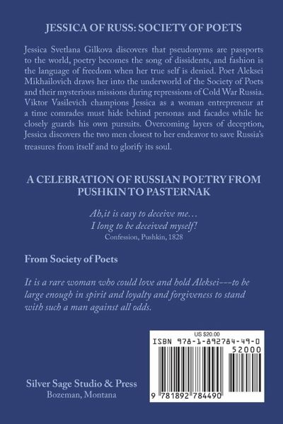 Jessica Svetlana Gilkova discovers that pseudonyms are passports to the world, poetry becomes the song of dissidents, and fashion is the language of freedom when the true self is denied. Drawn into the underworld of the Society of Poets by poet Alexsei, she becomes suspicious of his carefree life. She finds mysterious missions of dissidents caught in Cold War Russia threaten her haute couture boutique in Leningrad, that repression forces people and relationships to hide behind personas and facades. Meanwhile Viktor champions Jessica, a woman entrepreneur, while one of his stated desires is to obtain a fiery opal pendant formerly owned by the nobility. Overcoming denial and intrigue, she discovers he is a man with a mission