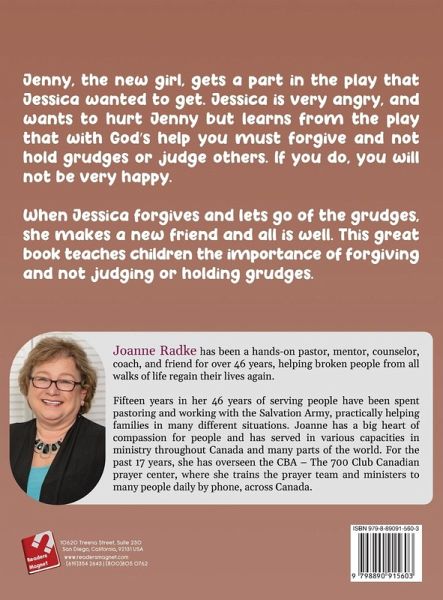 Jenny, the new girl, gets a part in the play that Jessica wanted to get. Jessica is very angry, and wants to hurt Jenny but learns from the play that with God's help you must forgive and not hold grudges or judge others. If you do, you will not be very happy. When Jessica forgives and lets go of the grudges, she makes a new friend and all is well. This great book teaches children the importance of forgiving and not judging or holding grudges.
