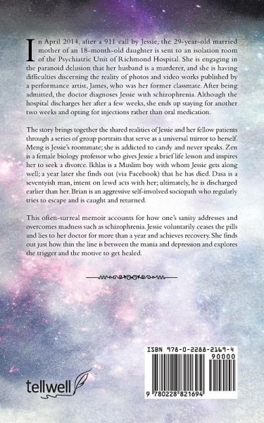 In April 2014, after a 911 call by Jessie, the 29 year-old married mother of an 18-month-old daughter is sent to an isolation room of the Psychiatric Unit of Richmond Hospital. She is engaging in the paranoia delusion that her husband is a murderer, and she is having difficulties discerning the reality of photos and video works published by a performance artist, James, who was her former classmate. After being admitted, the doctor diagnoses Jessie with schizophrenia. Although the hospital discharges her after a few weeks, she ends up staying for another two weeks and opting for injections rather than oral medication. The story brings together the shared realities of Jessie and her fellow patients through a series of group portraits that serve as a universal mirror to herself. Meng is Jessie's roommate; she is addiction to candy and never speaks. Zen is a female biology professor who gives Jessie a brief life lesson and inspires her to seek a divorce. Ikhlas is a Muslim boy with whom Jessie gets along well; a year later she finds out (via Facebook) that he has died. Dasa is a seventyish man, intent on lewd act with her; ultimately, he is discharged earlier than her. Brian is an aggressive self-involved sociopath who regularly tries to escape and is caught and returned. This often-surreal memoir accounts for how one's sanity addresses and overcomes madness such as schizophrenia. Jessie voluntarily ceases the pills and lies to her doctor for more than a year and achieves recovery. She finds out just how thin the line is between the mania and depression and explores the trigger and the motive to get healed.