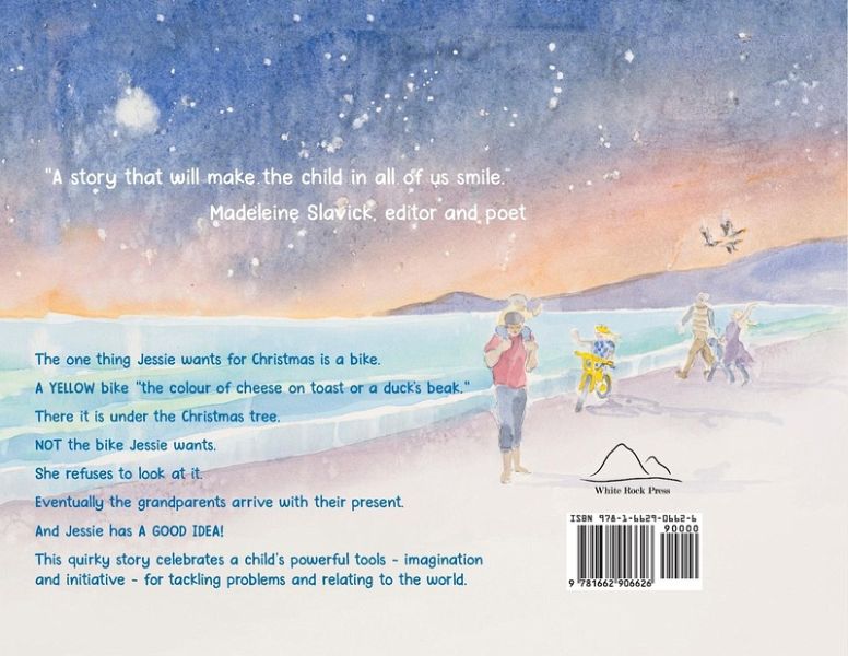 The one thing Jessie wants for Christmas is a bike. A YELLOW bike "the colour of cheese on toast or a duck's beak." There it is under the Christmas tree. NOT the bike Jessie wants. She refuses to look at it. Eventually the grandparents arrive with their present. And Jessie has A GOOD IDEA! This quirky story celebrates a child's powerful tools - imagination and initiative - for tackling problems and relating to the world. "Jessie's Yellow Bike" has been described as: "A story that will make the child in all of us smile." Madeleine Slavick, editor and poet. "Captivating for the young ones and fun for the oldies too! Love the " find the duck" in every illustration. Kids will love that." Victoria Deane, diplomat, lawyer. Pauline Bellamy, artist/ illustrator, read the script to her grand-daughter. Next day Pauline heard her chanting over and over, yellow ducks beaks, yellow ducks beaks. "She was enchanted!"