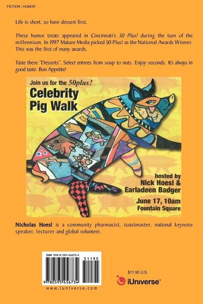 Life is short, so have dessert first. These humor treats appeared in Cincinnati's 50 Plus! during the turn of the millennium. In 1997 Mature Media picked 50 Plus! as the National Awards Winner. This was the first of many awards. Taste these "Desserts". Select entrees from soup to nuts. Enjoy seconds. It's always in good taste. Bon Appetite!