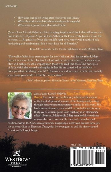 How does one go on living after your loved one leaves? What about the ones left behind enveloped in anguish? What does a person do with crushed faith? ?Jesus, a Love Like No Other! is a life-changing, inspirational book that will open your eyes to the love of Jesus. As you will see, ?Oh how He loves! Truly, Jesus is a love like no other.? ? Regardless of your place in life right now, readers will find this book motivating and inspirational. It is a must have for all libraries.? - Brian Ulch, associate pastor, Trinity Lighthouse Church, Denison, Texas ?The walk of faith is an eternal quest for every believer. And for my friend, Mary Berry, it is a way of life. Her love for God and her determination to be obedient to Him will make a valuable impact upon those who read this book. The principles of faith which she learned and applied in her life are contained in this book ? principles that can change your life! Discover a new dimension in faith that can help you change your world. Certainly it can be done!? - Bob Lothenore, pastor; Sherman Church of the Nazarene, Sherman, Texas