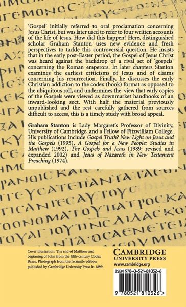 'Gospel' initially referred to oral proclamation concerning Jesus Christ, but was later used to refer to four written accounts of the life of Jesus. How did this happen? Here, distinguished scholar Graham Stanton uses new evidence and fresh perspectives to tackle this controversial question. He insists that in the early post-Easter period, the Gospel of Jesus Christ was heard against the backdrop of a rival set of 'gospels' concerning the Roman emperors. In later chapters Stanton examines the earliest criticisms of Jesus and of claims concerning his resurrection. Finally, he discusses the early Christian addiction to the codex (book) format as opposed to the ubiquitous roll, and undermines the view that early copies of the Gospels were viewed as downmarket handbooks of an inward looking sect. With half the material previously unpublished and the rest carefully gathered from sources difficult to access, this is a timely study with broad appeal.