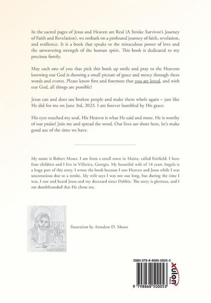 In the sacred pages of Jesus and Heaven are Real (A Stroke Survivor's Journey of Faith and Revelation), we embark on a profound journey of faith, revelation, and resilience. It is a book that speaks to the miraculous power of love and the unwavering strength of the human spirit. This book is dedicated to my precious family. May each one of you that pick this book up smile and pray to the Heavens knowing our God is showing a small picture of grace and mercy through these words and events. Please know first and foremost that you are loved, and with our God, all things are possible! Jesus can and does use broken people and make them whole again - just like He did for me on June 3rd, 2023. I am forever humbled by His grace. His eyes touched my soul, His Heaven is what He said and more. He is worthy of our praise! Join me and spread the word. Our lives are short here, let's make good use of the time we have. My name is Robert Moses. I am from a small town in Maine, called Fairfield. I have four children and I live in Villarica, Georgia. My beautiful wife of 14 years Angela is a huge part of this story. I wrote the book because I saw Heaven and Jesus while I was unconscious due to a stroke. My wife says I was not out long, but during the time I was, I saw and heard Jesus and my deceased sister Debbie. The story is glorious, and I am dumbfounded that He chose me.