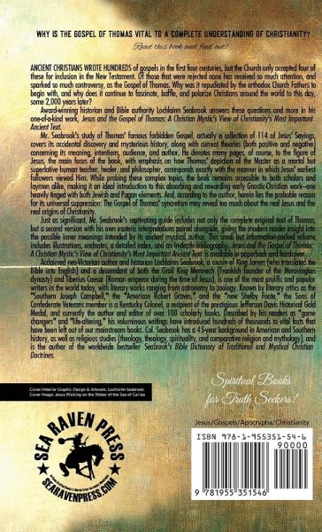 Ancient Christians wrote hundreds of gospels in the first four centuries, but the Church only accepted four of these for inclusion in the New Testament. Of those that were rejected none has received so much attention, and sparked so much controversy, as the Gospel of Thomas. Why was it repudiated by the orthodox Church Fathers to begin with, and why does it continue to fascinate, baffle, and polarize Christians around the world to this day, some 2,000 years later? Award-winning historian and Bible authority Lochlainn Seabrook answers these questions and more in his one-of-a-kind work, Jesus and the Gospel of Thomas: A Christian Mystic's View of Christianity's Most Important Ancient Text. Mr. Seabrook's study of Thomas' famous forbidden Gospel, actually a collection of 114 of Jesus' Sayings, covers its accidental discovery and mysterious history, along with current theories (both positive and negative) concerning its meaning, intentions, audience, and author. He devotes many pages, of course, to the figure of Jesus, the main focus of the book, with emphasis on how Thomas' depiction of the Master as a mortal but superlative human teacher, healer, and philosopher, corresponds exactly with the manner in which Jesus' earliest followers viewed Him. While probing these complex topics, the book remains accessible to both scholars and laymen alike, making it an ideal introduction to this absorbing and rewarding early Gnostic-Christian work-one heavily tinged with both Jewish and Pagan elements. And, according to the author, herein lies the probable reason for its universal suppression: The Gospel of Thomas' syncretism may reveal too much about both the real Jesus and the real origins of Christianity. Just as significant, Mr. Seabrook's captivating guide includes not only the complete original text of Thomas, but a second version with his own esoteric interpretations paired alongside, giving the modern reader insight into the possible inner meanings intended by its ancient mystical author. This small but information-packed volume includes illustrations, endnotes, a detailed index, and an in-depth bibliography. Jesus and the Gospel of Thomas: A Christian Mystic's View of Christianity's Most Important Ancient Text is available in paperback and hardcover. (All text copyright (c) Sea Raven Press) Award-winning historian Lochlainn Seabrook is the bestselling author and editor of over 100 books, including: Jesus and the Gospel of Q; The Greatest Jesus Mystery of All Time; Seabrook's Bible Dictionary of Traditional and Mystical Christian Doctrines; Christmas Before Christianity; Christ is All and in All; Jesus and the Law of Attraction; The Bible and the Law of Attraction; America's Three Constitutions; The Encyclopedia of the Battle of Franklin; Britannia Rules: Goddess-Worship in Ancient Anglo-Celtic Society; Abraham Lincoln Was a Liberal, Jefferson Davis Was a Conservative; Secrets of Celebrity Surnames; Authentic Victorian Ghost Stories; Manmade: Male Inventors Who Created the Modern World; North America's Amazing Mammals; The Concise Book of Owls; Your Soul Lives Forever; UFOs and Aliens; The Articles of Confederation Explained; Mysterious Invaders; Rocky Mountain Equines; Everything You Were Taught About the Civil War is Wrong, Ask a Southerner!