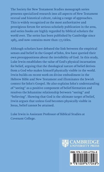 Although scholars have debated the link between empirical senses and belief in the Gospel of John, few have queried their own presuppositions about the invisibility of God. In this study, Luke Irwin establishes the value of God's physical incarnation for belief, arguing that the theological nature of belief derives from a God who makes himself physically visible in the world. Irwin builds on recent work on divine embodiment in the Hebrew Bible and New Testament and illuminates the Jewish context for John's Gospel. He also explains John's understanding of 'seeing' as a positive component of belief-formation and resolves the Johannine relationship between 'seeing' and 'believing'. Showing how God is the ultimate target of belief, Irwin argues that unless God becomes physically visible in Jesus, belief cannot be attained.
