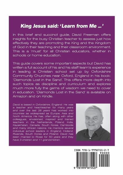 In this brief and succinct guide, David Freeman offers insights for the busy Christian teacher to assess just how effectively they are promoting the King and the Kingdom of God in their teaching and their classroom environment. This is a ‘must’ for all Christian educators, whether in schools or home education. It covers some important aspects but David has written a full account of his and his staff team’s experience in leading a Christian school set up by Oxfordshire Community Churches near Oxford, England in his book, ‘Diamonds Lost in the Sand’. This offers more depth into such topics as discipline and curriculum and explores much more fully the gems of wisdom we need to cover in education. ‘Diamonds Lost in the Sand’ is available on Amazon and on Kindle.